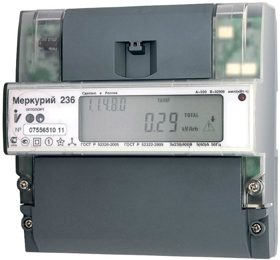 Счётчик Меркурий 236 – трёхфазное устройство, используемое для замеров потреблённой электроэнергии при подключении в электросеть с тремя или четырьмя проводами, с функцией определения показателей по нескольким расценкам.