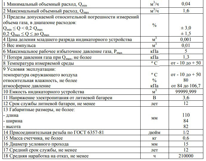 Счётчик относится к категории бытовых компактных устройств учёта расхода используемого газа. Он предназначен для измерения объёма проходящего в системе газопровода природного или сжиженного газа. Технические характеристики позволяют использовать его в системе снабжённой газовой плитой с четырьмя конфорками и духовкой.