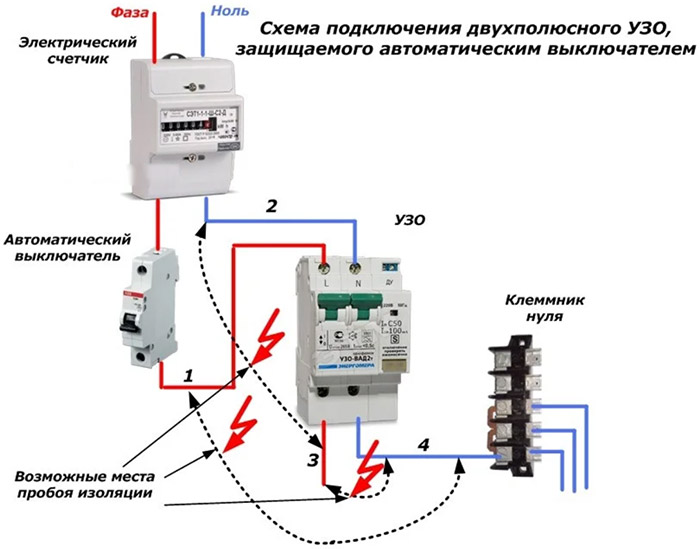 - двухполюсные – при аналогичной величине напряжения (на 2 провода –фазный и нулевой);