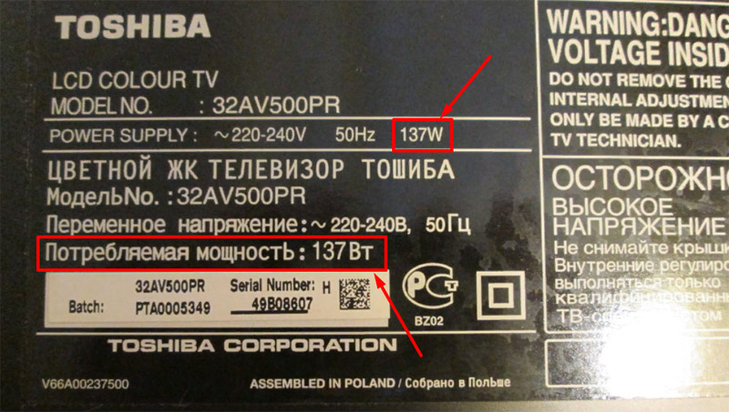 Для расчётов нужно знать: какой вид телевизора и его мощность. Мощность можно найти в характеристиках на упаковке или на оборотной стороне телевизора, значение которое нам понадобится выделено красным прямоугольником. Мощность пишется: Вт или W. В нашел случае она равна 137 Вт.