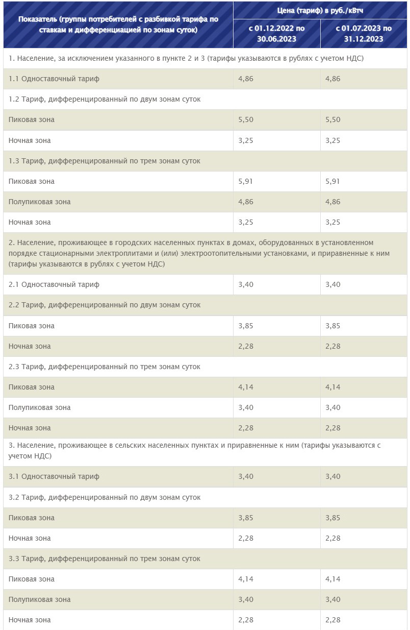 Смоленской области с 1 декабря 2022 г. в соответствии с положениями администрации региона — Приказ Департамента по энергетике, энергоэффективности, тарифной политике Смоленской области от 18.11.2022 № 94 «Об установлении тарифов на электрическую энергию для населения Смоленской области на 2023 год».