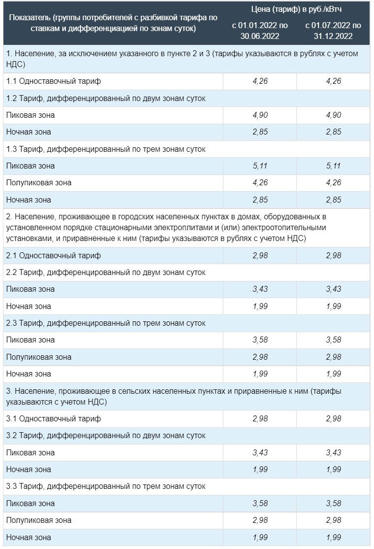 Обозначенные тарифы предназначены для вычисления стоимости оплаты потребленной эл. энергии согласно показаниям счетчиков. Действие тарифов делятся на два полугодия: 1 полугодие начинается с 1 января 2022 г. по 30 июня 2022 г., а 2 полугодие с 1 июля 2022 г. по 31 декабря 2022 г.